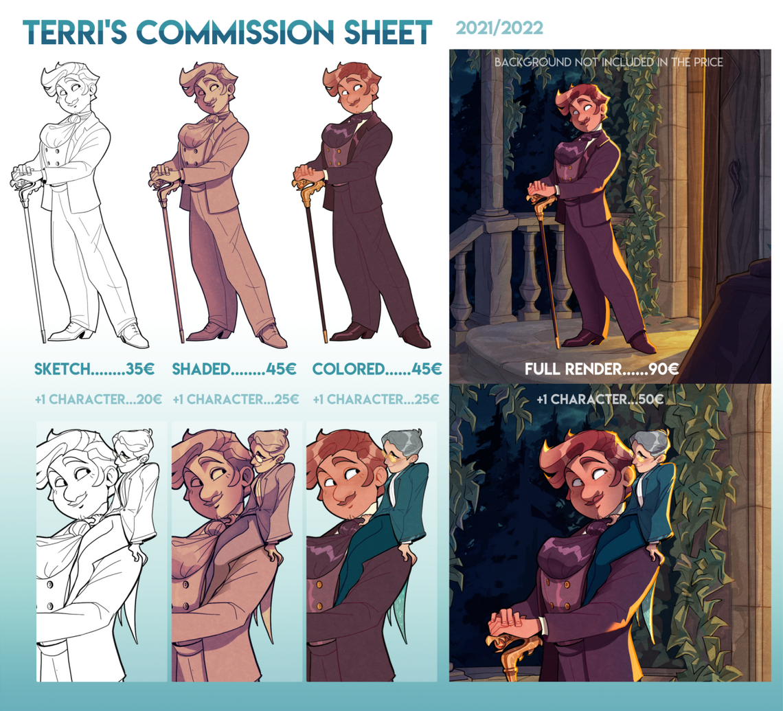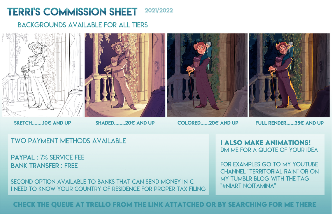 Commissions are paid in euros, either through PayPal (+7% service fee) or with a bank transfer (free)