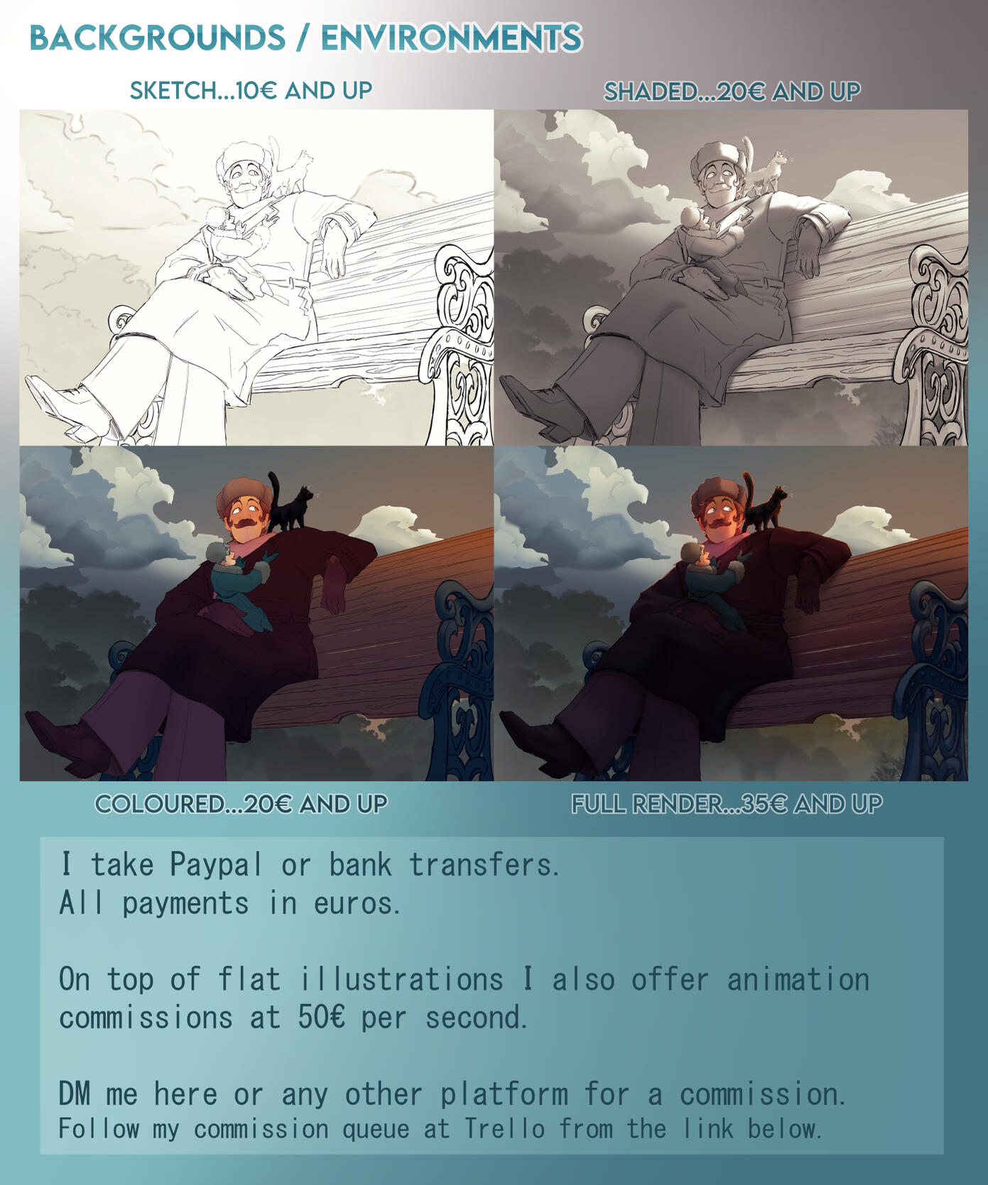 Commissions are paid in euros, either through PayPal or with a bank transfer.